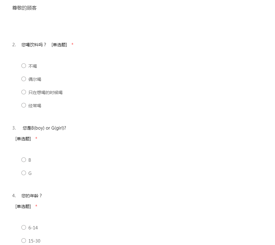 感谢您参加饮料的消费情况调查问卷,本次调查完全匿名进行,所有问答仅用于统计分析。请您依据实际情况选择合适的选项,或在相应的横线上填写。感谢您能够在百忙中抽出时间来填写此问卷,谢谢!