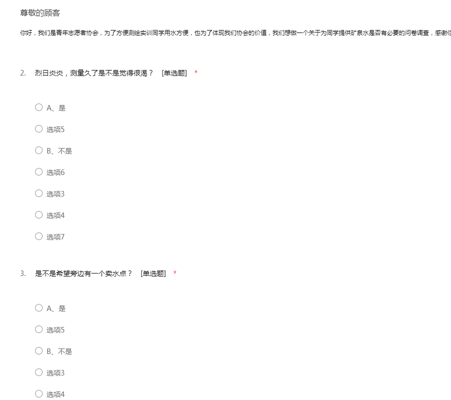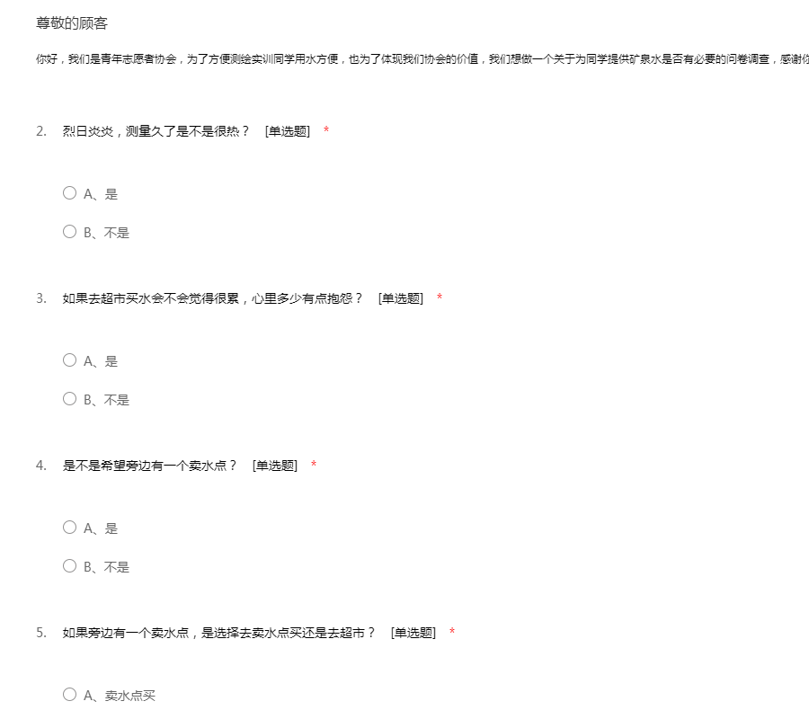 你好,我们是青年志愿者协会,为了方便测绘实训同学用水方便,也为了体现我们协会的价值,我们想做一个关于为同学提供矿泉水是否有必要的问卷调查,感谢你的参与。
