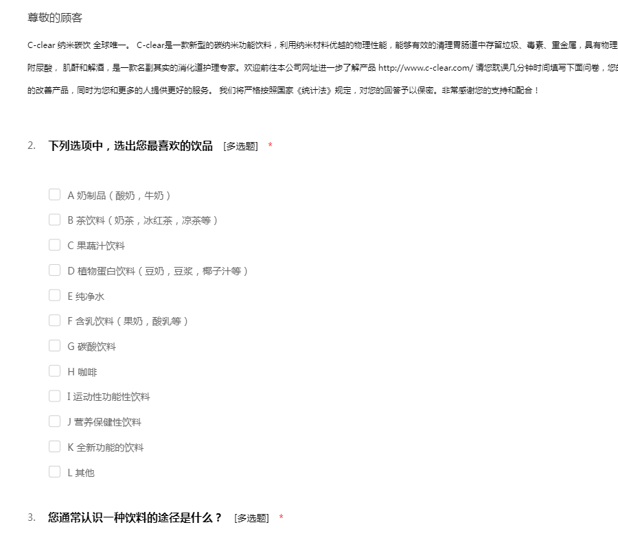 C-clear 纳米碳饮 全球唯一。 C-clear是一款新型的碳纳米功能饮料,利用纳米材料优越的物理性能,具有物理广谱杀菌功能,能够有效的清理胃肠道中存留垃圾、毒素、重金属,防止腹泻,胃酸,胃胀,吸附尿酸, 肌酐和解酒,是一款名副其实的消化道护理专家。欢迎前往本公司网址进一步了解产品 http://www.c-clear.com/。 请您耽误几分钟时间请填写下面问卷,您的回答对于我们是非常宝贵的,让我们能够更好的改善产品,以便于为您和更多的消费者提供更好的服务。 我们将严格按照国家《统计法》规定,对您的回答予以保密。非常感谢您的支持和配合!