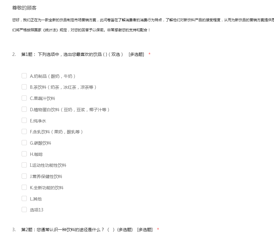 您好,我们正在为一款全新的饮品制定市场营销方案,此问卷旨在了解消费者的消费行为特点,了解他们对新饮料产品的接受程度,从而为新饮品的营销方案提供思路和依据。 完成此问卷需要6-8分钟的时间,我们将严格按照国家《统计法》规定,对您的回答予以保密。非常感谢您的支持和配合!