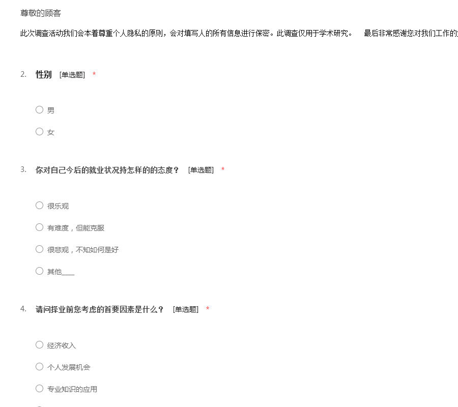 此次调查活动我们会本着尊重个人隐私的原则,会对填写人的所有信息进行保密。此调查仅用于学术研究。 最后非常感谢您对我们工作的大力支持!祝您学业有成,生活愉快。