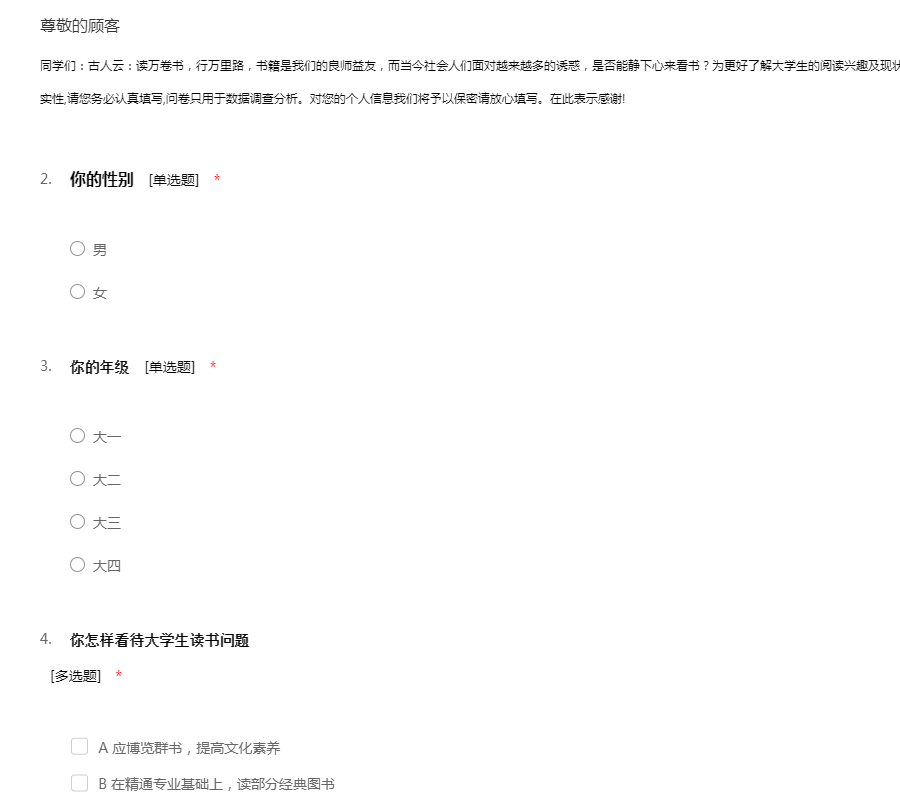 同学们:古人云:读万卷书,行万里路,书籍是我们的良师益友,而当今社会人们面对越来越多的诱惑,是否能静下心来看书?为更好了解大学生的阅读兴趣及现状,特进行此次调查。为了保证数据的可靠性和真实性,请您务必认真填写,问卷只用于数据调查分析。对您的个人信息我们将予以保密请放心填写。在此表示感谢!