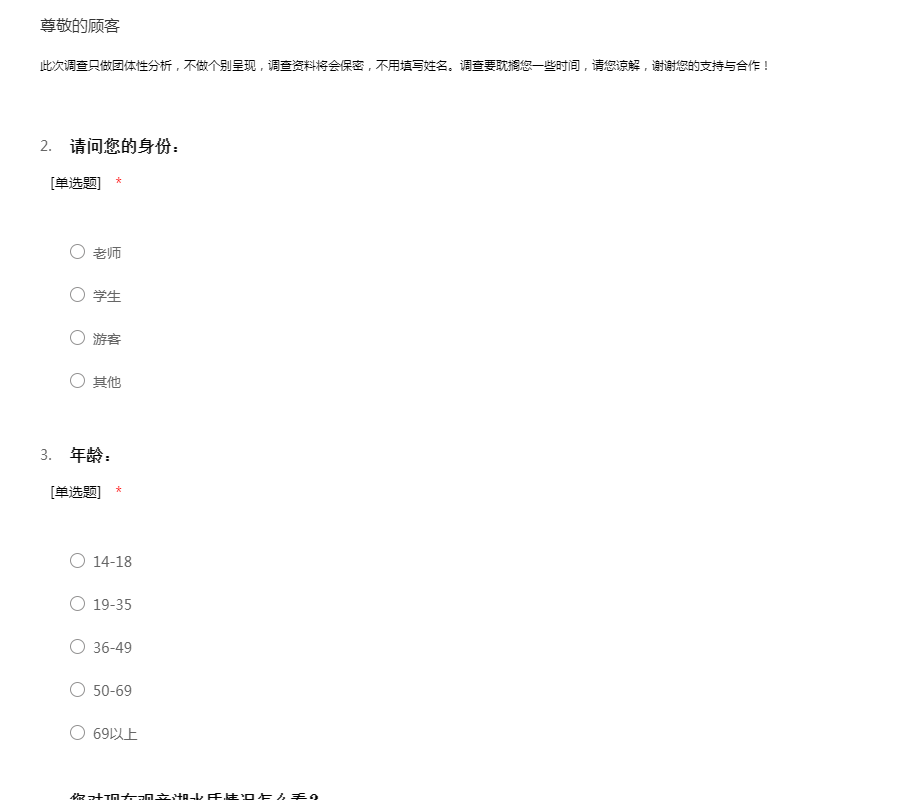 此次调查只做团体性分析,不做个别呈现,调查资料将会保密,不用填写姓名。调查要耽搁您一些时间,请您谅解,谢谢您的支持与合作!