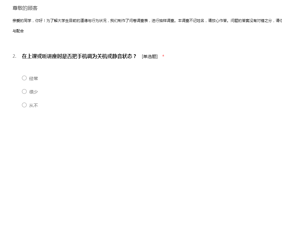 亲爱的同学,你好!为了解大学生目前的道德与行为状况,我们制作了问卷调查表,进行抽样调查。本调查不记姓名,请放心作答。问题的答案没有对错之分,请你根据自己的实际情况填写。 衷心感谢你的支持与配合