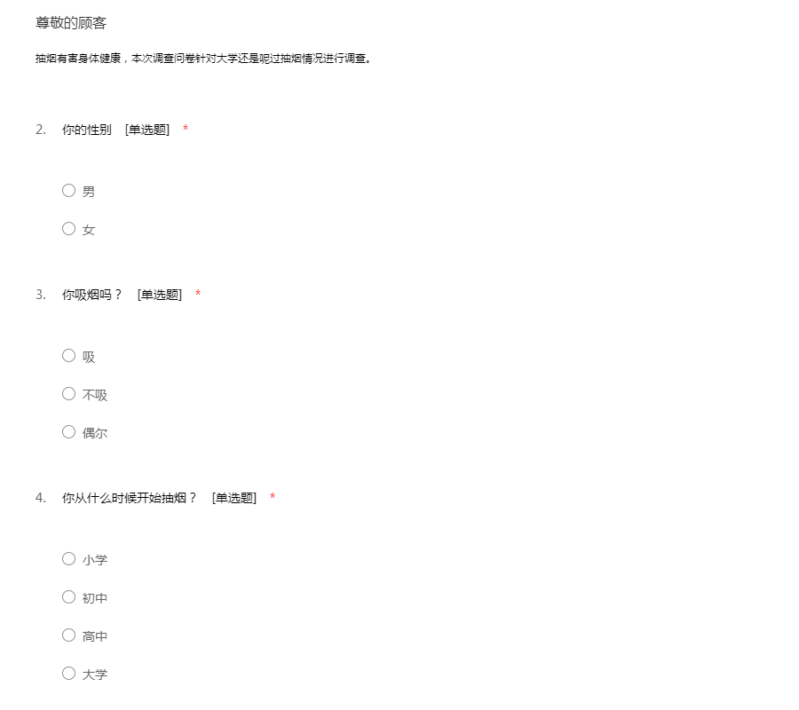 抽烟有害身体健康,本次调查问卷针对大学还是呢过抽烟情况进行调查。
