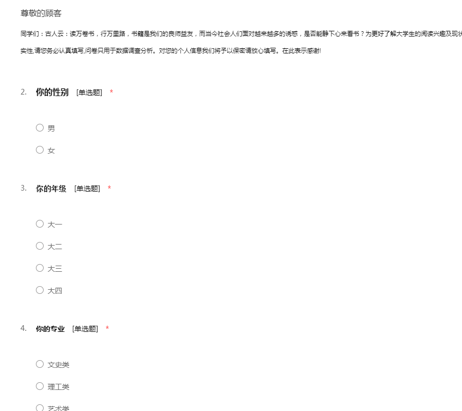 同学们:古人云:读万卷书,行万里路,书籍是我们的良师益友,而当今社会人们面对越来越多的诱惑,是否能静下心来看书?为更好了解大学生的阅读兴趣及现状,特进行此次调查。为了保证数据的可靠性和真实性,请您务必认真填写,问卷只用于数据调查分析。对您的个人信息我们将予以保密请放心填写。在此表示感谢!