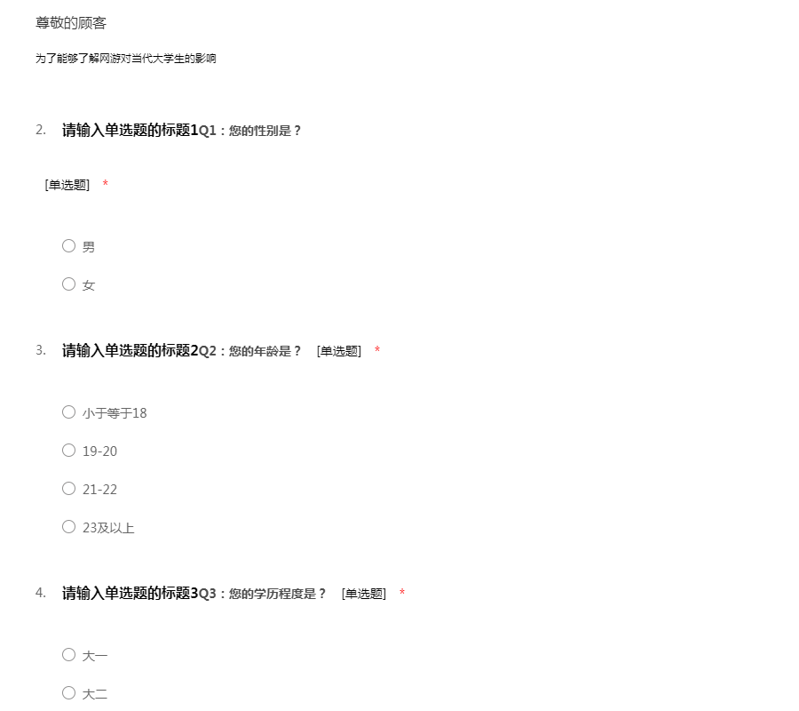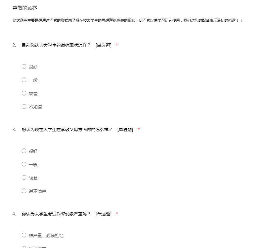 此次调查主要是想通过问卷的形式来了解在校大学生的思想道德修养的现状,此问卷仅供学习研究使用,我们对您的配合表示深切的感谢!!