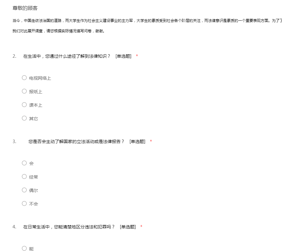当今,中国走依法治国的道路,而大学生作为社会主义建设事业的主力军,大学生的素质受到社会各个阶层的关注,而法律意识是素质的一个重要表现方面。为了了解大学生的法律意识情况,提高大学生的素质,我们对此展开调查,请您根据实际情况填写问卷,谢谢。