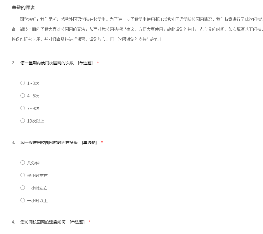 同学您好:我们是浙江越秀外国语学院在校学生。为了进一步了解学生使用浙江越秀外国语学院校园网情况,我们特意进行了此次问卷调查。希望通过对各专业在校学生的调查,能较全面的了解大家对校园网的看法。从而对我校网站提出建议,方便大家使用。故此请您能抽出一点宝贵的时间,如实填写以下问卷,我们将以不记名方式进行调查,调查资料仅作研究之用,并对调查资料进行保密,请您放心。再一次感谢您的支持与合作!