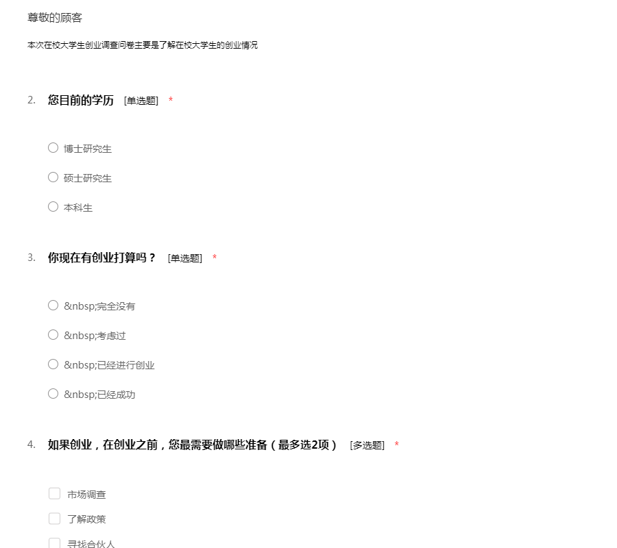 本次在校大学生创业调查问卷主要是了解在校大学生的创业情况