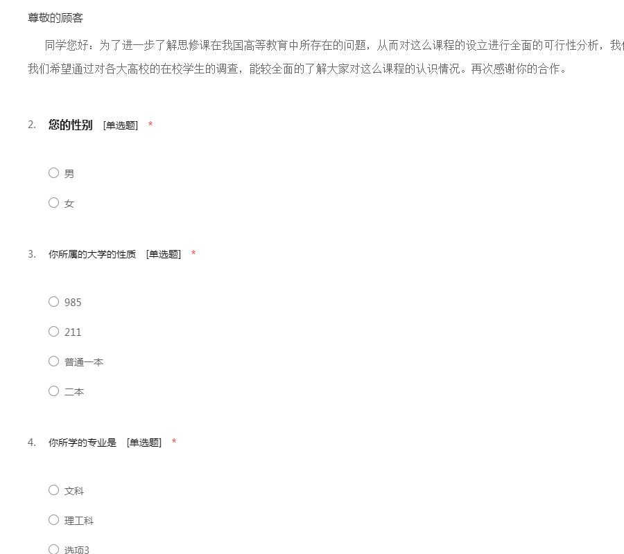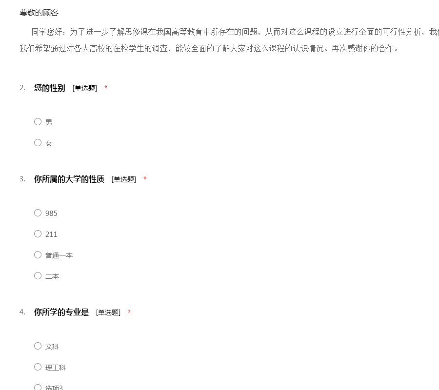 同学您好:为了进一步了解思修课在我国高等教育中所存在的问题,从而对这么课程的设立进行全面的可行性分析,我们特意进行了此次实地的问卷调查。我们希望通过对各大高校的在校学生的调查,能较全面的了解大家对这么课程的认识情况。再次感谢你的合作。