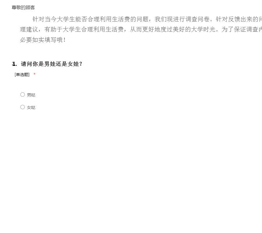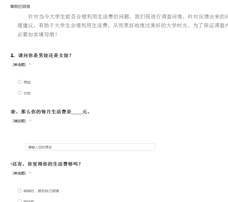 针对当今大学生能否合理利用生活费的问题,我们现进行调查问卷。针对反馈出来的问题,我们将会给出一些合理建议,有助于大学生合理利用生活费,从而更好地度过美好的大学时光。为了保证调查内容真实可靠。请同学们务必要如实填写哦!