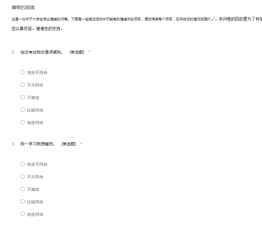 这是一份关于大学生学业情绪的问卷。下面是一些描述活动中可能有的情绪体验项目,请您阅读每个项目,在符合您的情况后面打√。本问卷的目的是为了科学研究,请据实填写,答案无对错之分,请您认真作答。谢谢您的支持。