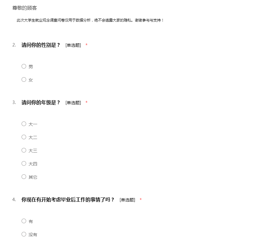 此次大学生就业观念调查问卷仅用于数据分析,绝不会透露大家的隐私。谢谢参与与支持!