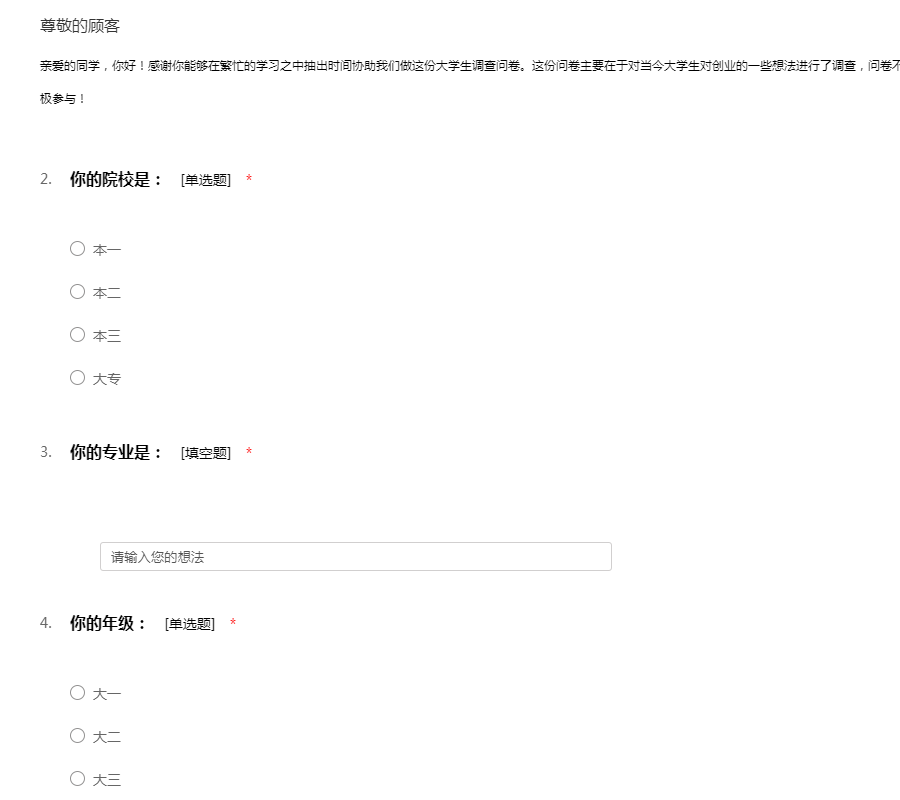 亲爱的同学,你好!感谢你能够在繁忙的学习之中抽出时间协助我们做这份大学生调查问卷。这份问卷主要在于对当今大学生对创业的一些想法进行了调查,问卷不记名,希望你能根据实际情况填答。感谢你的积极参与!