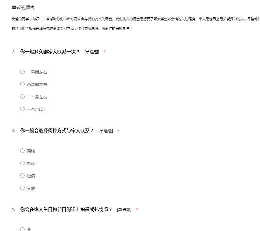 亲爱的同学,你好!非常感谢你们抽出时间来参与我们此次的调查。我们此次的调查是想要了解大学生对亲情的关注程度。亲人是世界上最关爱我们的人,尽管他们的方式并不相同。但我们最爱的,又是否是我们的亲人呢?相信在填写完这份调查问卷后,你会有所思考。感谢你的积极参与!