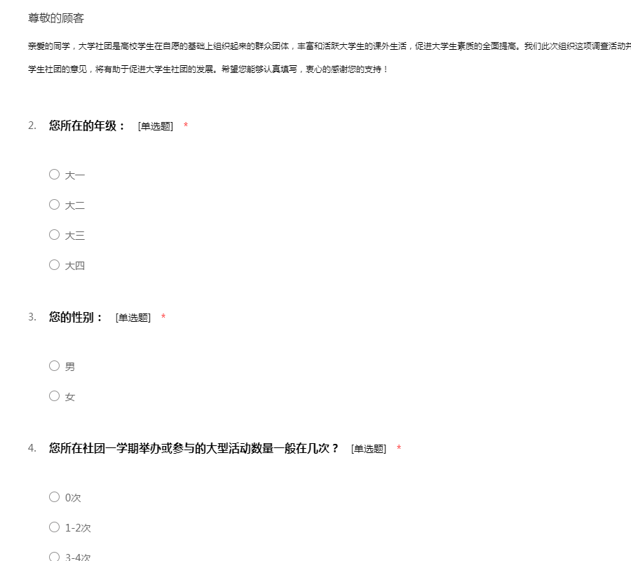 亲爱的同学,大学社团是高校学生在自愿的基础上组织起来的群众团体,丰富和活跃大学生的课外生活,促进大学生素质的全面提高。我们此次组织这项调查活动并设计了这份大学生调查问卷,想要听一听您对大学生社团的意见,将有助于促进大学生社团的发展。希望您能够认真填写,衷心的感谢您的支持!