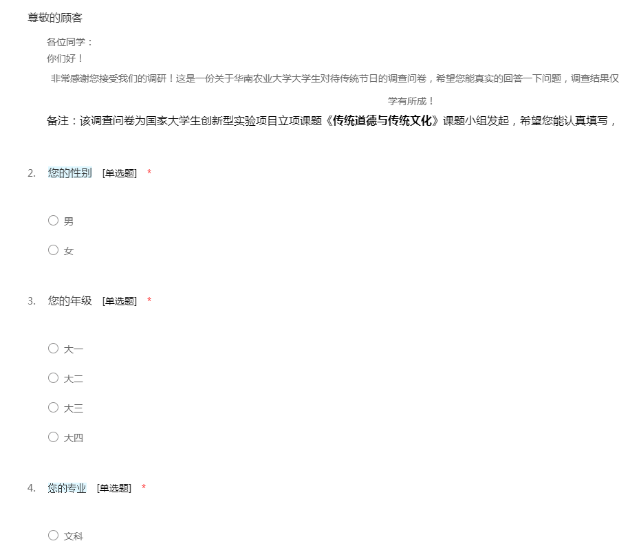 各位同学: 你们好! 非常感谢您接受我们的调研!这是一份关于华南农业大学大学生对待传统节日的调查问卷,希望您能真实的回答一下问题,调查结果仅用于课题研究,请放心。祝您学习进步,学有所成! 备注:该调查问卷为国家大学生创新型实验项目立项课题《传统道德与传统文化》课题小组发起,希望您能认真填写,祝您学习生活愉快。