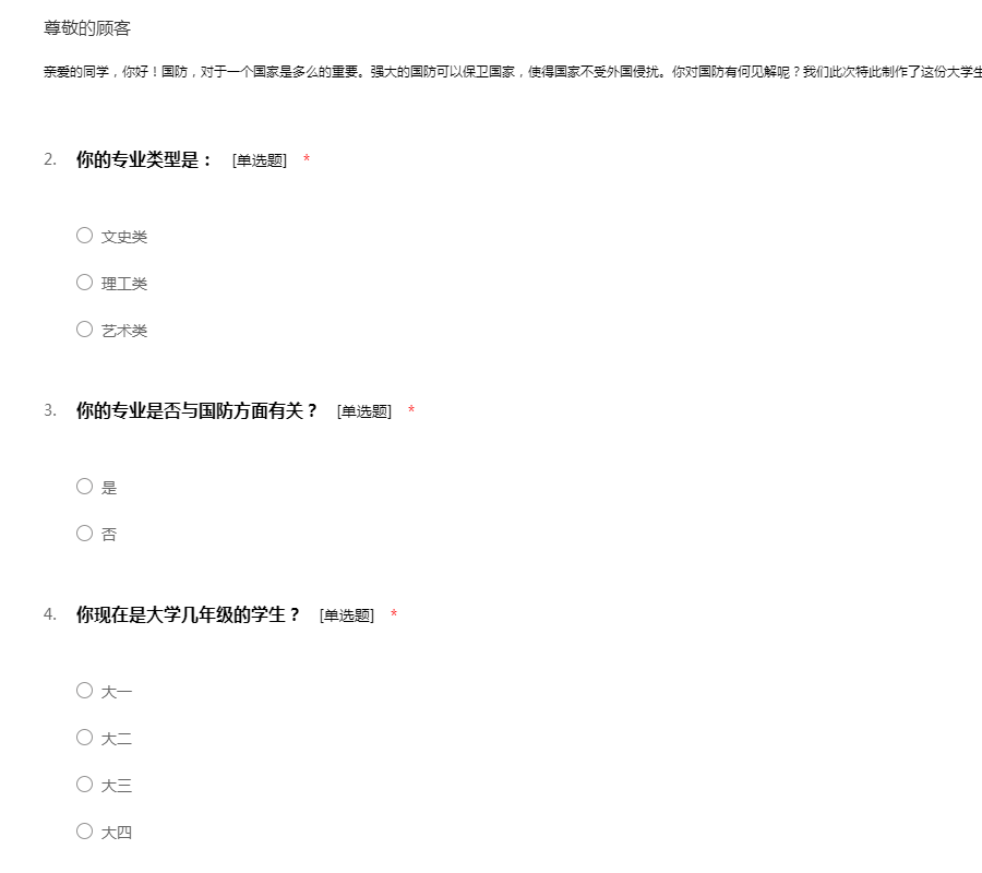 亲爱的同学,你好!国防,对于一个国家是多么的重要。强大的国防可以保卫国家,使得国家不受外国侵扰。你对国防有何见解呢?我们此次特此制作了这份大学生国防意识调查问卷,欢迎你的参与!