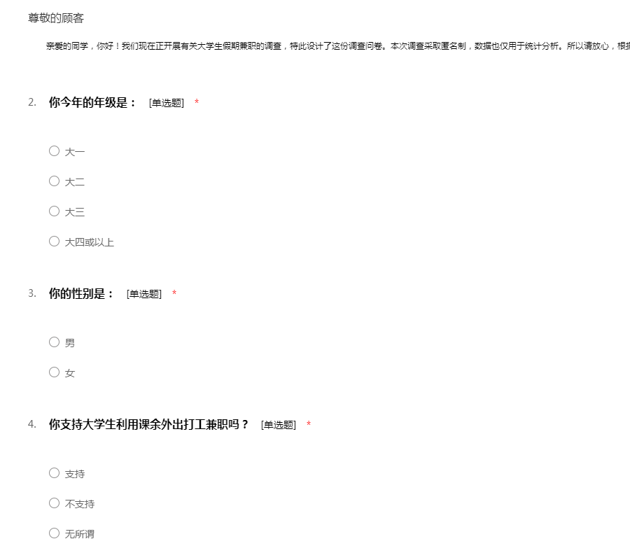 ——亲爱的同学,你好!我们现在正开展有关大学生假期兼职的调查,特此设计了这份调查问卷。本次调查采取匿名制,数据也仅用于统计分析。所以请放心,根据实际情况如实填写。感谢你的理解与支持!