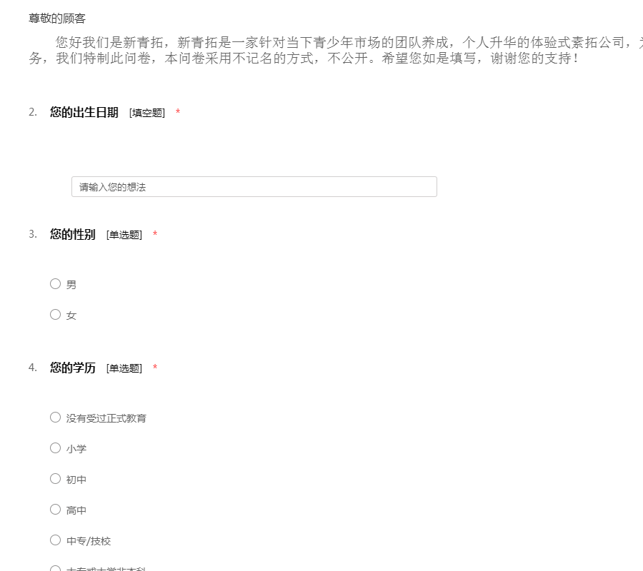 您好我们是新青拓,新青拓是一家针对当下青少年市场的团队养成,个人升华的体验式素拓公司,为了更好地为您提供我们的服务,我们特制此问卷,本问卷采用不记名的方式,不公开。希望您如是填写,谢谢您的支持!
