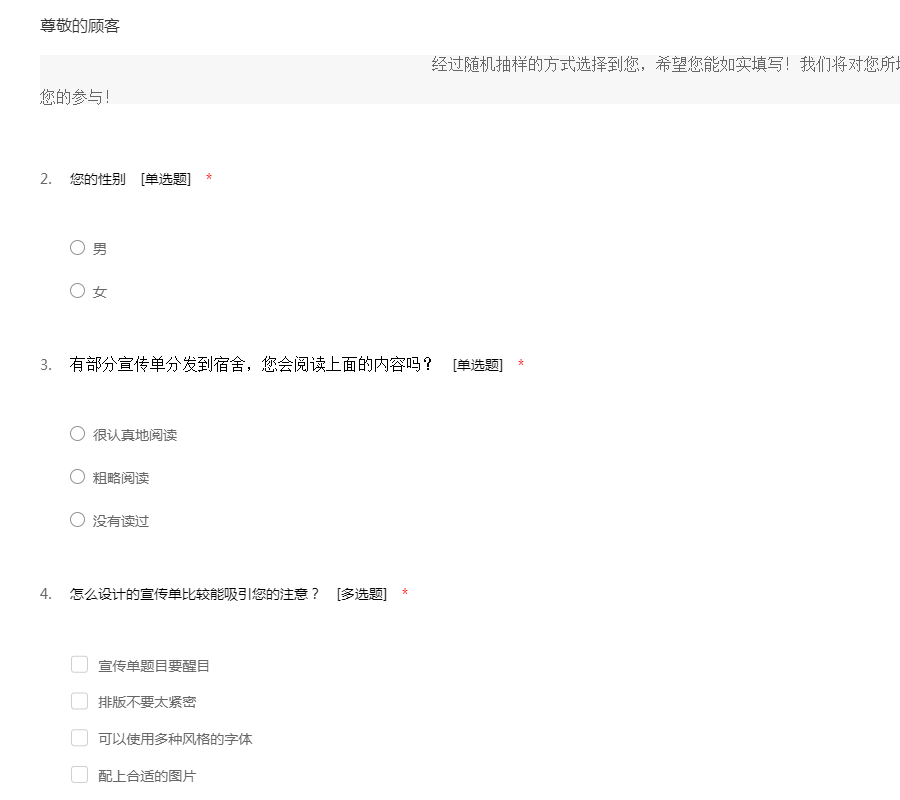 为了了解宣传单对大学生的影响,提高商家的宣传效果.经过随机抽样的方式选择到您,希望您能如实填写!我们将对您所填信息进行保密,请放心填写。感谢您的参与!