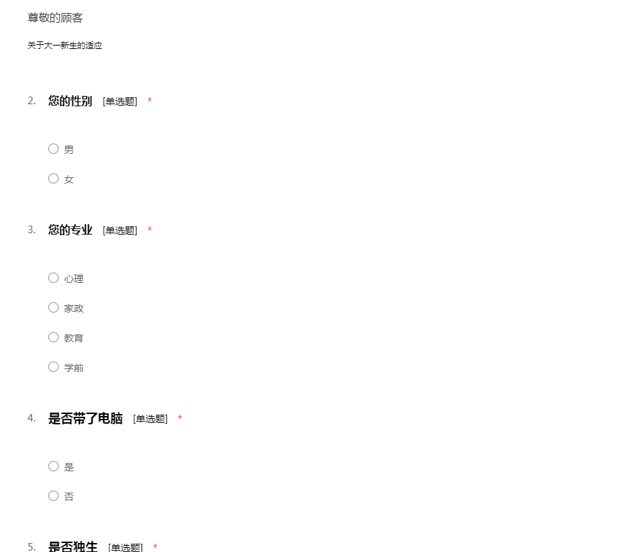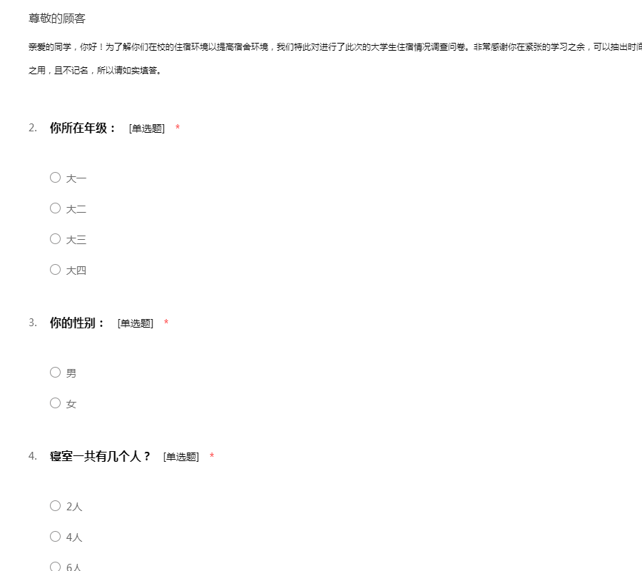亲爱的同学,你好!为了解你们在校的住宿环境以提高宿舍环境,我们特此对进行了此次的大学生住宿情况调查问卷。非常感谢你在紧张的学习之余,可以抽出时间协助我们此次的调查。此次调查结果仅用于研究之用,且不记名,所以请如实填答。