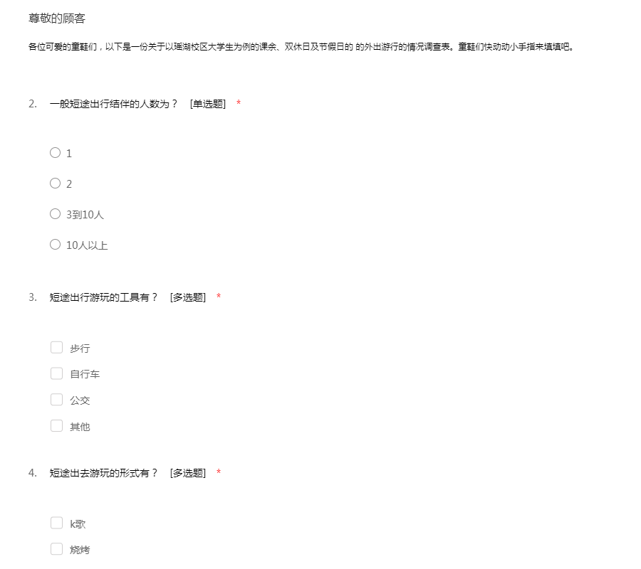 各位可爱的童鞋们,以下是一份关于以瑶湖校区大学生为例的课余、双休日及节假日的 的外出游行的情况调查表。童鞋们快动动小手指来填填吧。