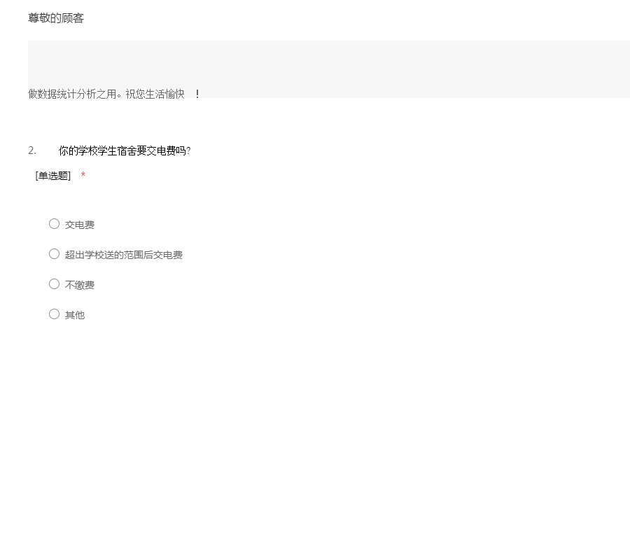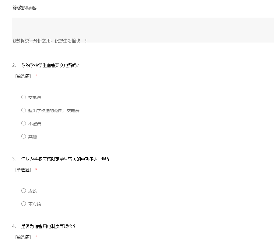 由于学校近期在学生用电方面做出一些变动,我想通过这份调查了解各个兄弟大学关于学生在校用水电的使用方式和消费情况仅是为作初步的了解,你的答案对我们来说是非常重要和有价值的,非常抱歉占用您的宝贵时间来填我们的问卷,您认真的填写是对我们调查的极大支持,我们表示衷心的感谢。您所给的答案没有对错之分并且都会进行保密处理,仅做数据统计分析之用。祝您生活愉快 !