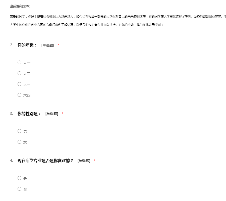 亲爱的同学,你好!随着社会就业压力越来越大,如今也有相当一部分的大学生对自己的未来感到迷茫,有的同学在大学里就选择了考研、公务员或是创业等等。本问卷就大学生创业意识进行问卷调查,了解作为大学生的你们在创业方面的兴趣程度和了解情况,以便我们作为参考并加以扶持。对你的协助,我们在此表示感谢!