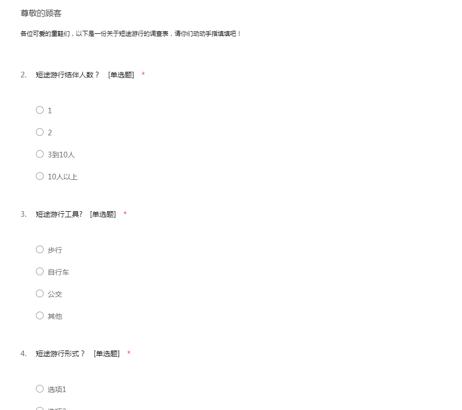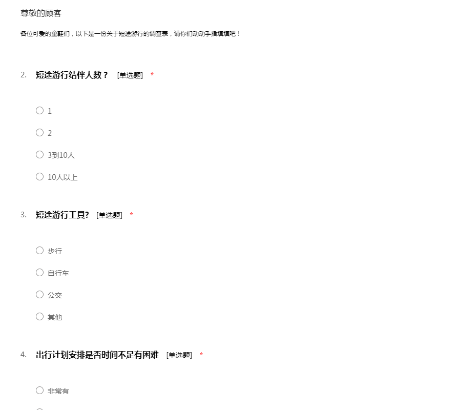 各位可爱的童鞋们,以下是一份关于短途游行的调查表,请你们动动手指填填吧!