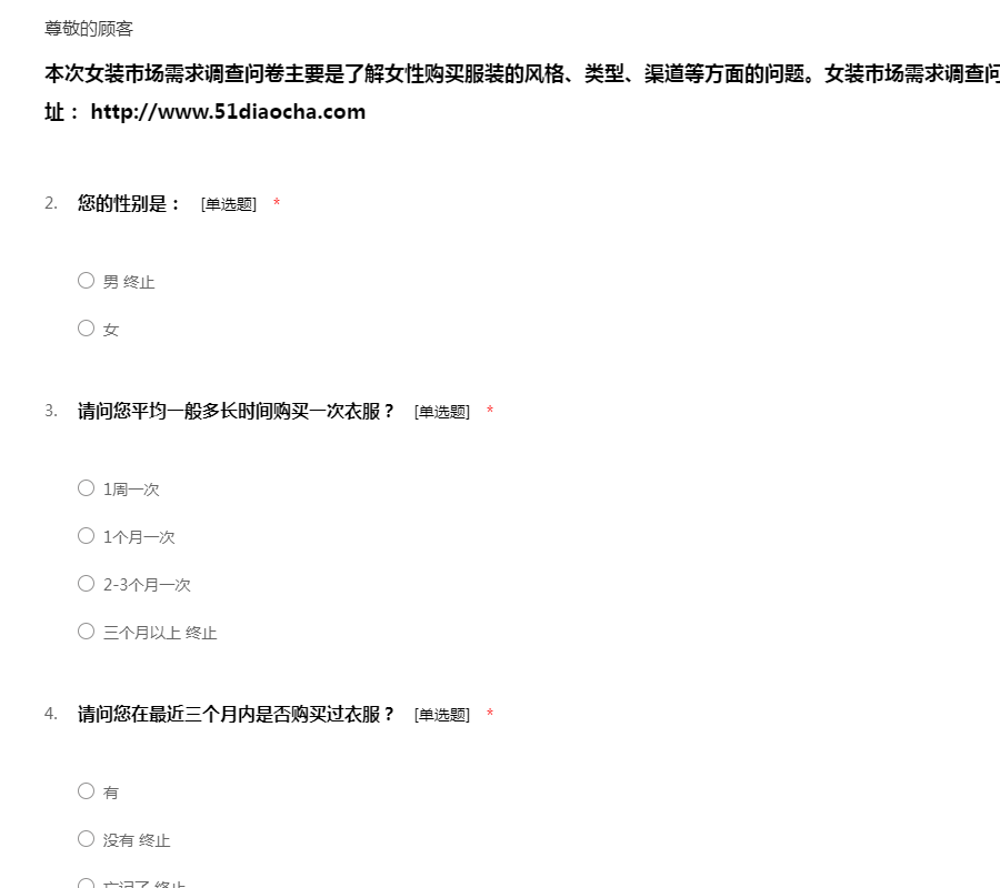 本次女装市场需求调查问卷主要是了解女性购买服装的风格、类型、渠道等方面的问题。女装市场需求调查问卷模板是由我要调查网提供,网址: http://www.51diaocha.com