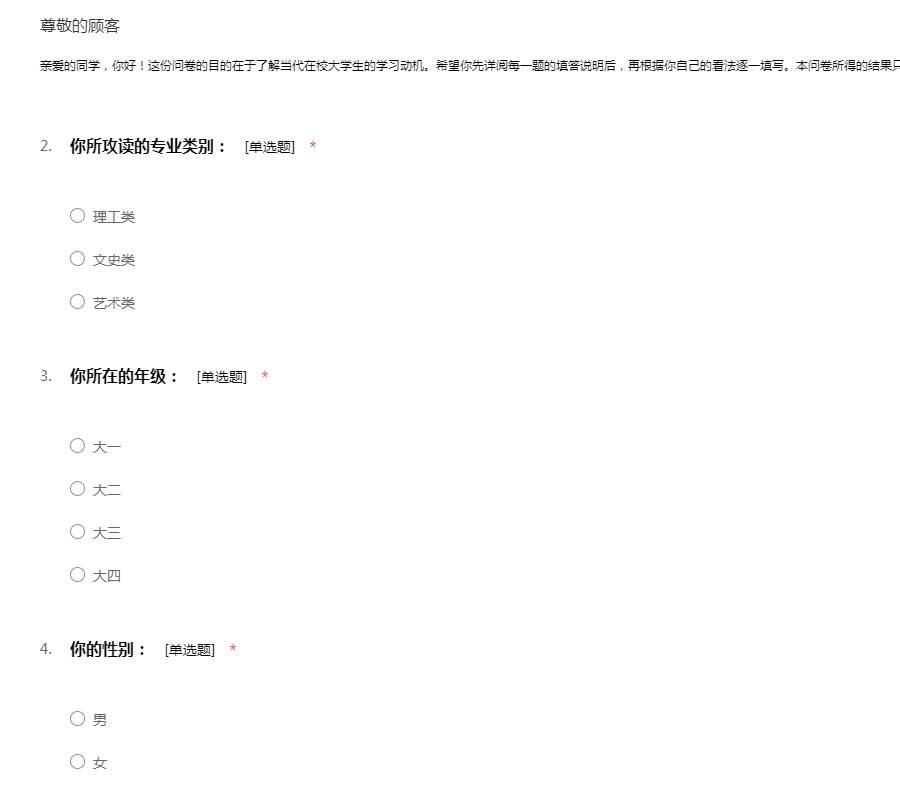 亲爱的同学,你好!这份问卷的目的在于了解当代在校大学生的学习动机。希望你先详阅每一题的填答说明后,再根据你自己的看法逐一填写。本问卷所得的结果只做团体性的分析,不做任何个别呈现。