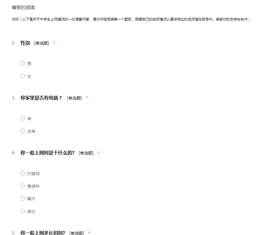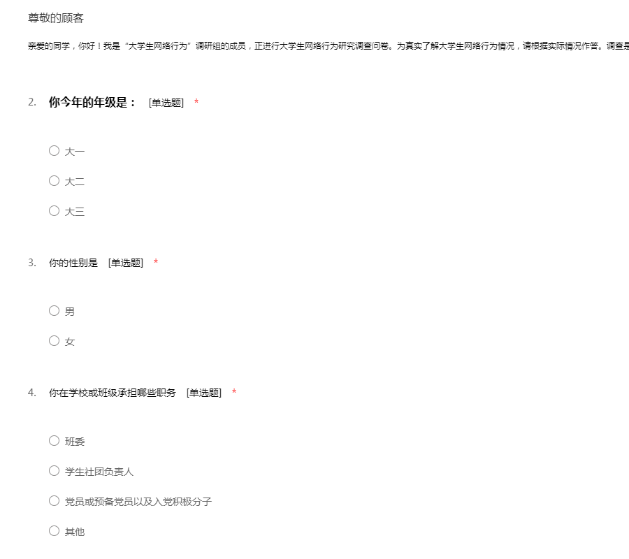 亲爱的同学,你好!我是“大学生网络行为”调研组的成员,正进行大学生网络行为研究调查问卷。为真实了解大学生网络行为情况,请根据实际情况作答。调查是匿名的,所以请放心填答。非常感谢你的支持!