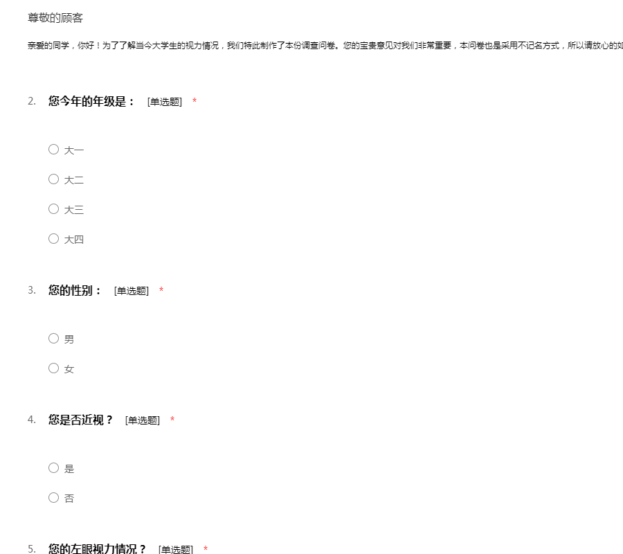 亲爱的同学,你好!为了了解当今大学生的视力情况,我们特此制作了本份调查问卷。您的宝贵意见对我们非常重要,本问卷也是采用不记名方式,所以请放心的如实填写。感谢您的参与!