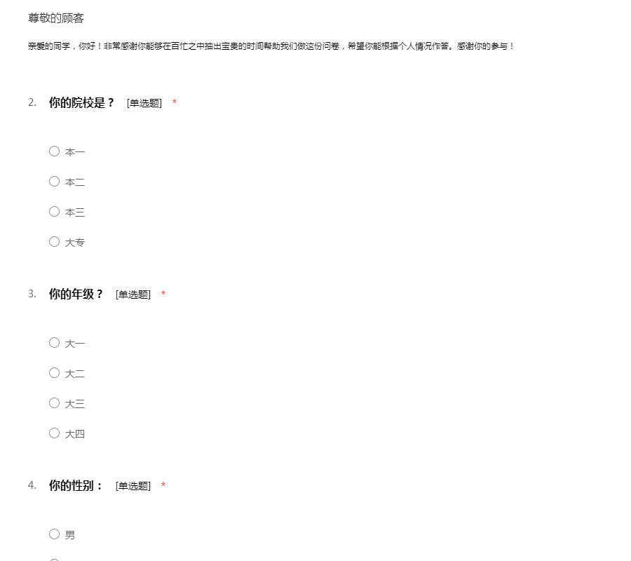 亲爱的朋友,你好!为了了解全国高校校园建设的具体情况,以及你的满意度程度,我们特此制作了本份调查问卷。你的宝贵意见对我们非常重要,本问卷也是采用不记名方式,所以请放心的如实填写。感谢你的支持与配合!