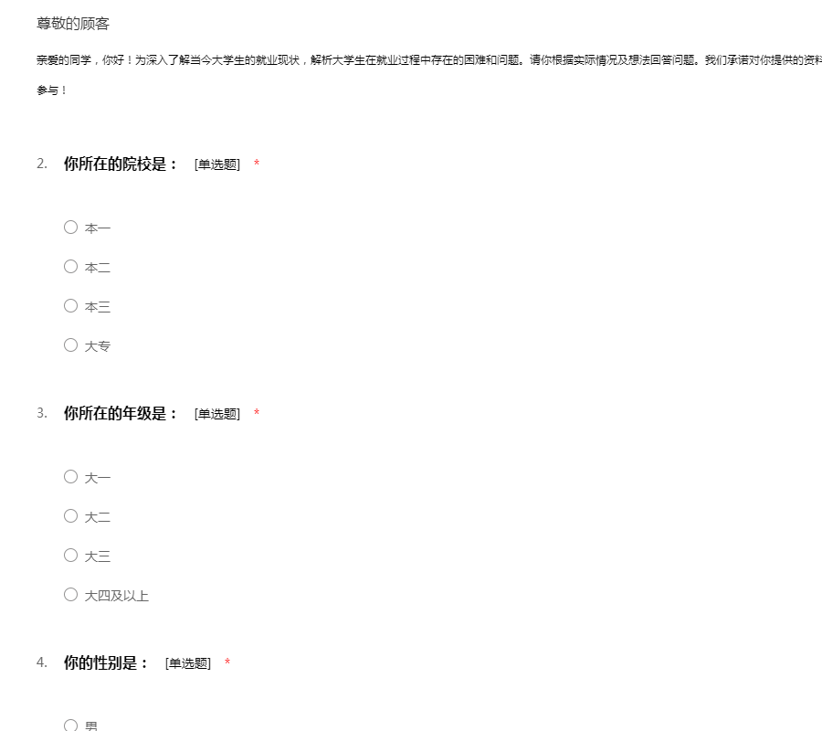 亲爱的同学,你好!为深入了解当今大学生的就业现状,解析大学生在就业过程中存在的困难和问题。请你根据实际情况及想法回答问题。我们承诺对你提供的资料和看法给予绝对保密,请你认真填写。感谢你的参与!