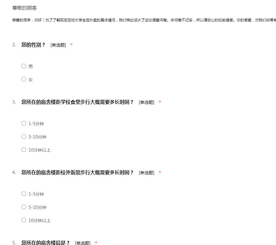 亲爱的同学,你好!为了了解现在在校大学生定外卖的具体情况,我们特此设计了这份调查问卷。本问卷不记名,所以请放心的如实填答。你的答案,对我们非常有帮助。感谢你的配合!