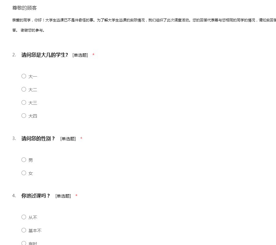 亲爱的同学,你好!大学生逃课已不是件奇怪的事。为了解大学生逃课的实际情况,我们组织了此次调查活动。您的回答代表着与您相同的同学的情况,请如实回答。所有回答资料都只用于统计分析,请您如实回答。 谢谢您的参与。