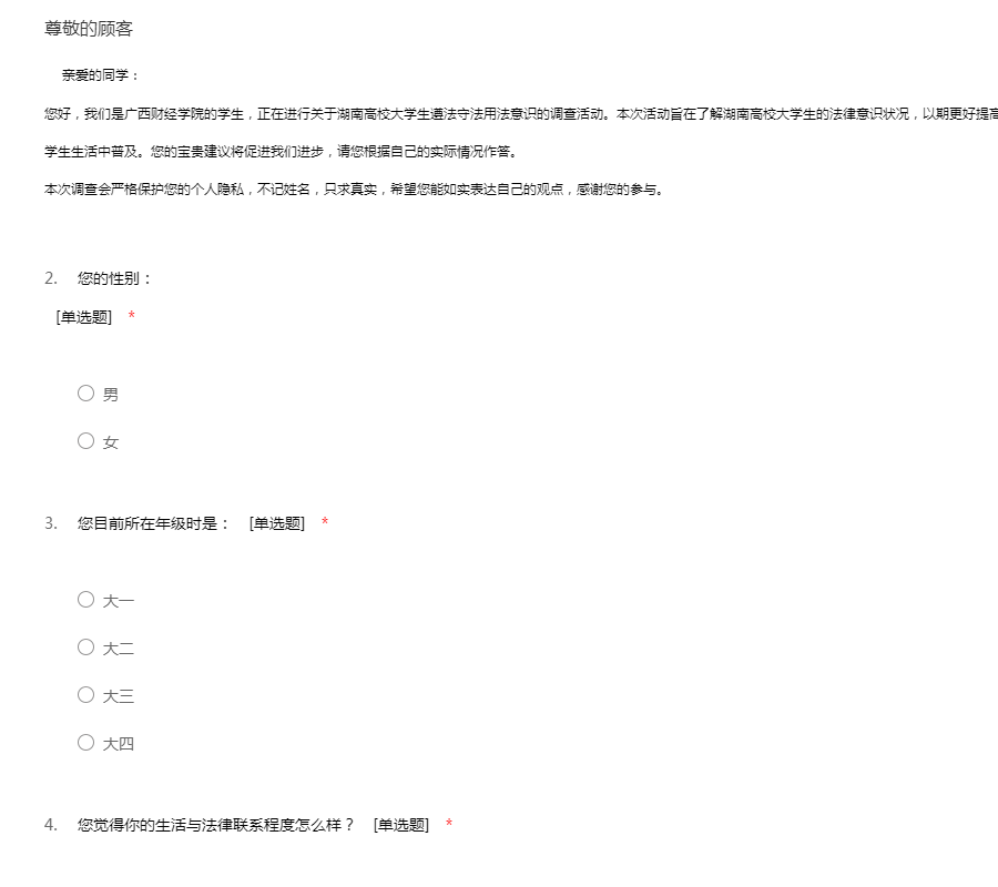 亲爱的同学: 您好,我们是广西财经学院的学生,正在进行关于湖南高校大学生遵法守法用法意识的调查活动。本次活动旨在了解湖南高校大学生的法律意识状况,以期更好提高大学生的遵法守法用法意识,促进法制知识在大学生生活中普及。您的宝贵建议将促进我们进步,请您根据自己的实际情况作答。 本次调查会严格保护您的个人隐私,不记姓名,只求真实,希望您能如实表达自己的观点,感谢您的参与。