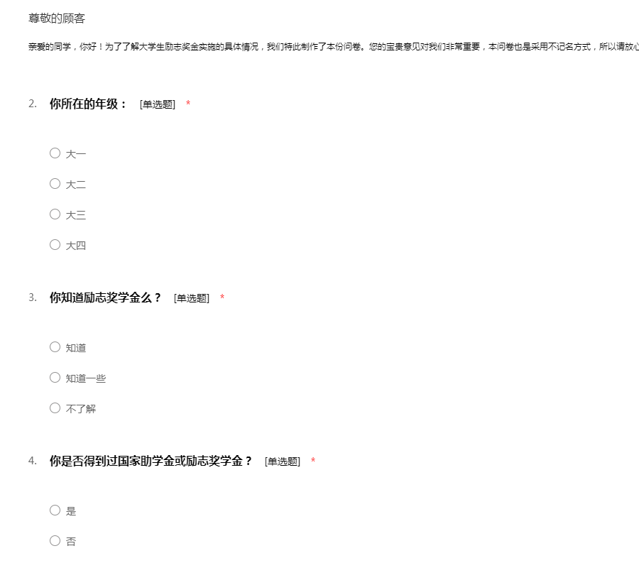 亲爱的同学,你好!为了了解大学生励志奖金实施的具体情况,我们特此制作了本份问卷。您的宝贵意见对我们非常重要,本问卷也是采用不记名方式,所以请放心的如实填写。感谢你的参与与配合!