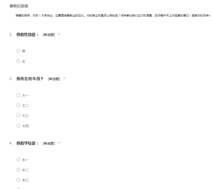 ——亲爱的同学,你好!大学毕业,边要面临着就业的压力。你的就业观是怎么样的呢?快来参加我们这次的调查,在问卷中天上你宝贵的意见!感谢你的支持!