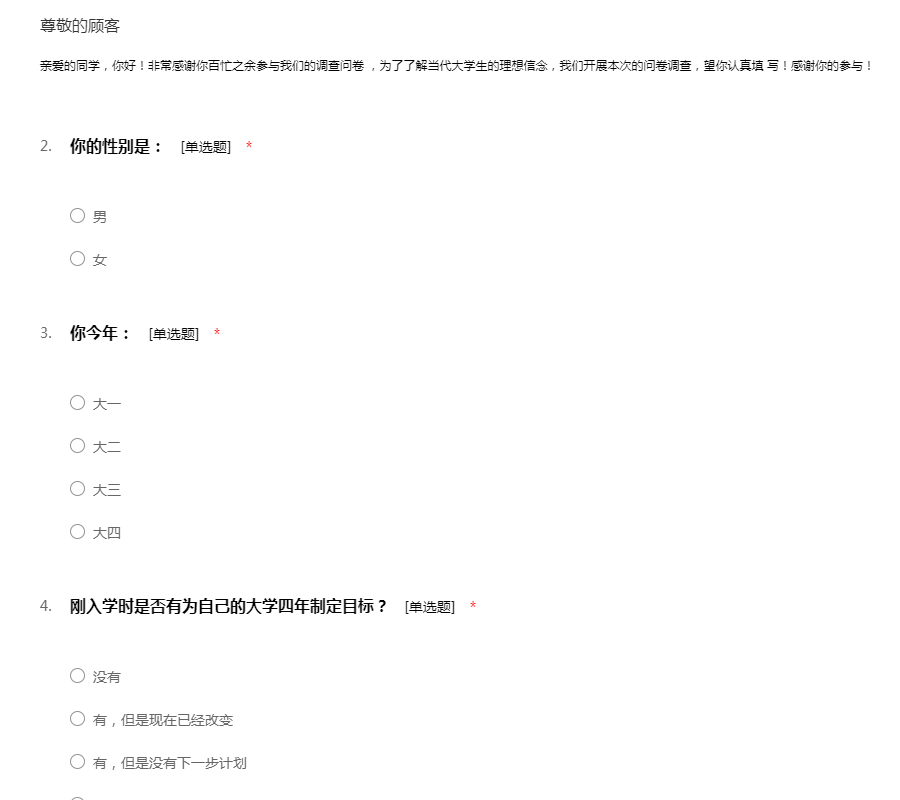 亲爱的同学,你好!非常感谢你百忙之余参与我们的调查问卷 ,为了了解当代大学生的理想信念,我们开展本次的问卷调查,望你认真填 写!感谢你的参与!