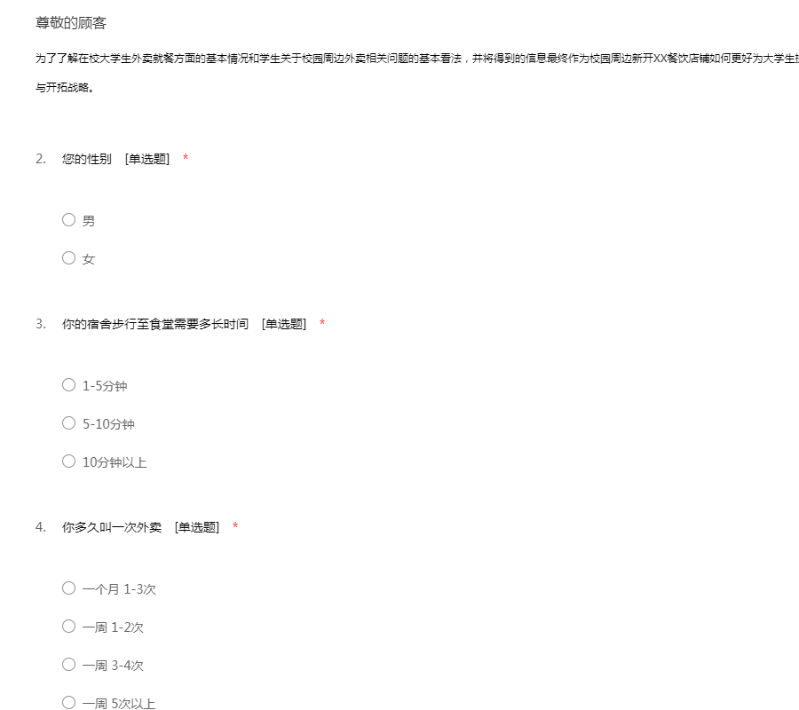 为了了解在校大学生外卖就餐方面的基本情况和学生关于校园周边外卖相关问题的基本看法,并将得到的信息最终作为校园周边新开XX餐饮店铺如何更好为大学生提供外卖服务的决策基础,辅助制定店铺的经营与开拓战略。