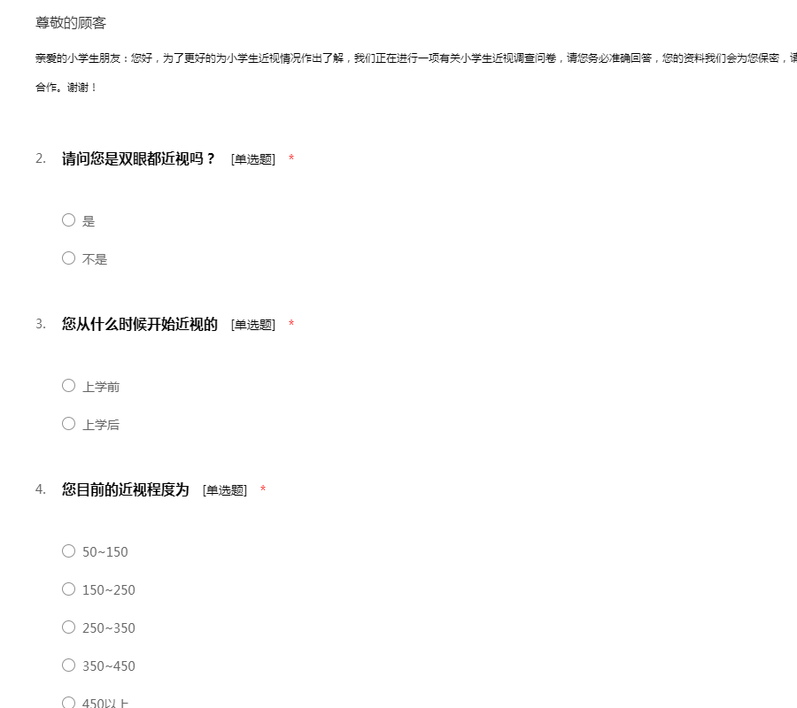 亲爱的小学生朋友:您好,为了更好的为小学生近视情况作出了解,我们正在进行一项有关小学生近视调查问卷,请您务必准确回答,您的资料我们会为您保密,请您放心填写小学生近视调查问卷。希望等到您的合作。谢谢!