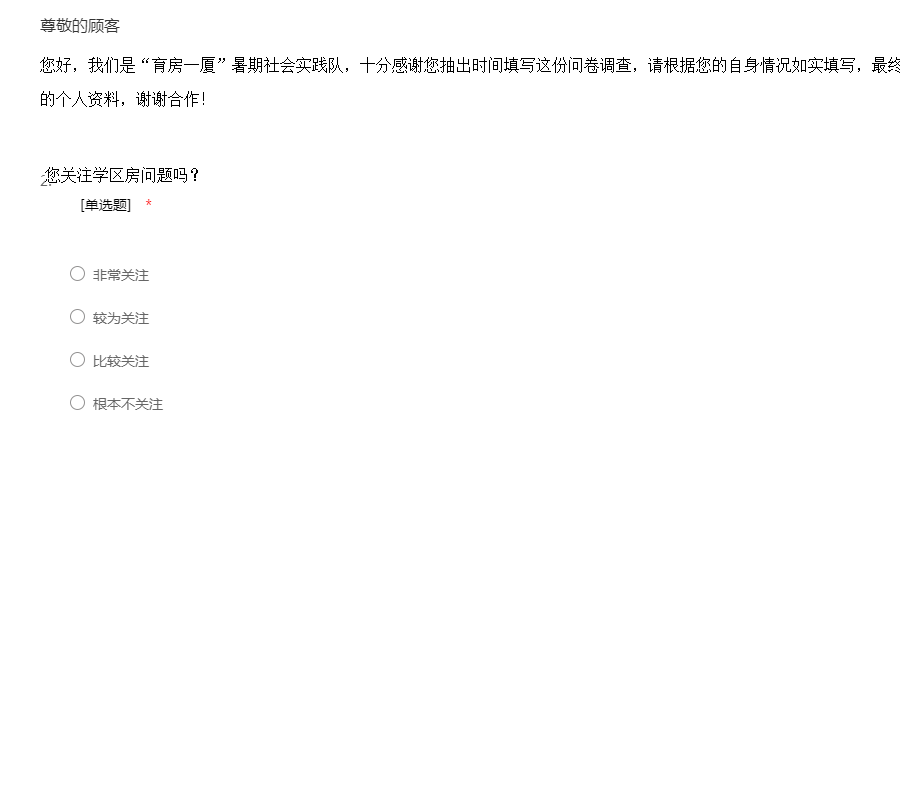 您好,我们是“育房一厦”暑期社会实践队,十分感谢您抽出时间填写这份问卷调查,请根据您的自身情况如实填写,最终结果仅作为学术研究,不会外泄您的个人资料,谢谢合作!