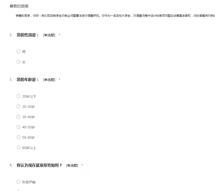 ——亲爱的同学,你好!我们现在对学生对就业问题进行调查,作为一名在校大学生的你对调查中各个问题最具发言权。你的答案将对我们有着重大的帮助,所以请认真填答。在此,向你致以诚挚的谢意!