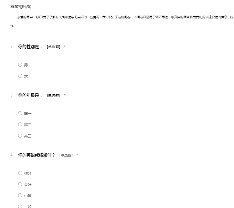 ——亲爱的同学,你好!为了了解有关高中生学习英语的一些情况,我们设计了这份问卷。本问卷只是用于调研用途,您真实的回答将为我们提供建设性的信息,统计结果绝对不用作成绩参考。谢谢您的支持与合作!
