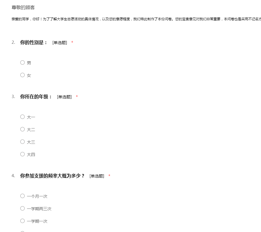 亲爱的同学,你好!为了了解大学生志愿活动的具体情况,以及您的意愿程度,我们特此制作了本份问卷。您的宝贵意见对我们非常重要,本问卷也是采用不记名方式,所以请放心的如实填写。感谢您的配合!