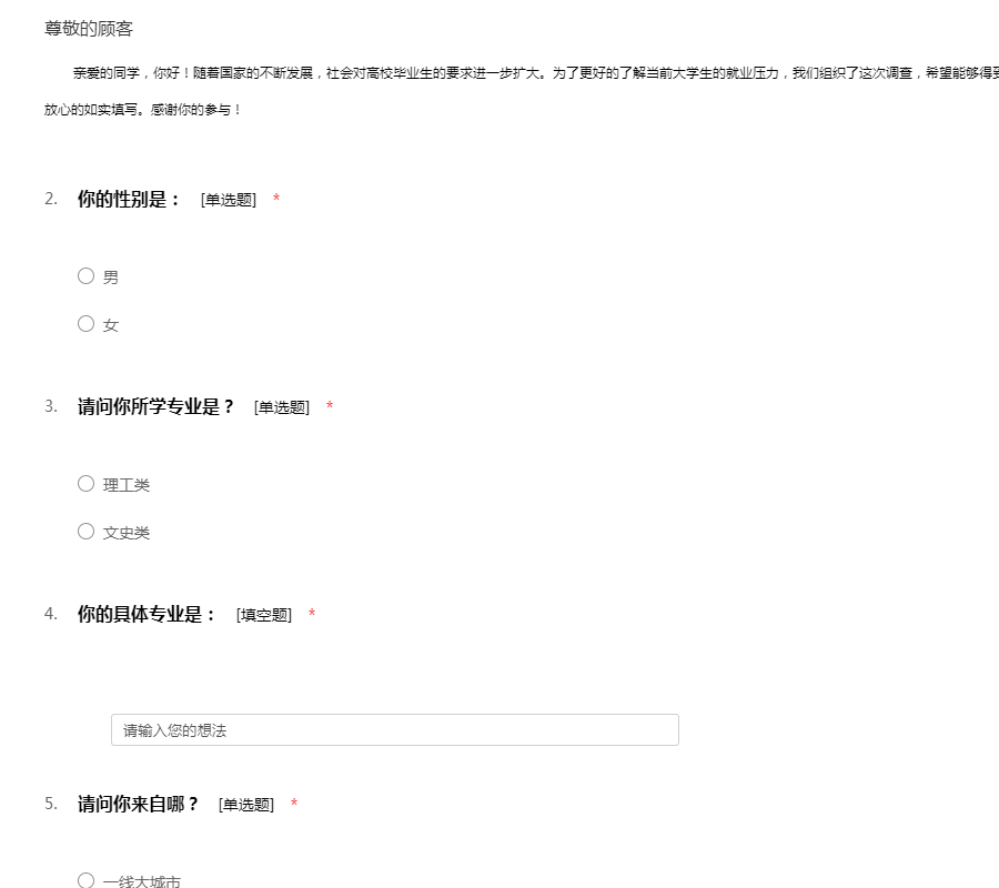 ——亲爱的同学,你好!随着国家的不断发展,社会对高校毕业生的要求进一步扩大。为了更好的了解当前大学生的就业压力,我们组织了这次调查,希望能够得到你们的支持与合作。本问卷采取不记名方式,请放心的如实填写。感谢你的参与!